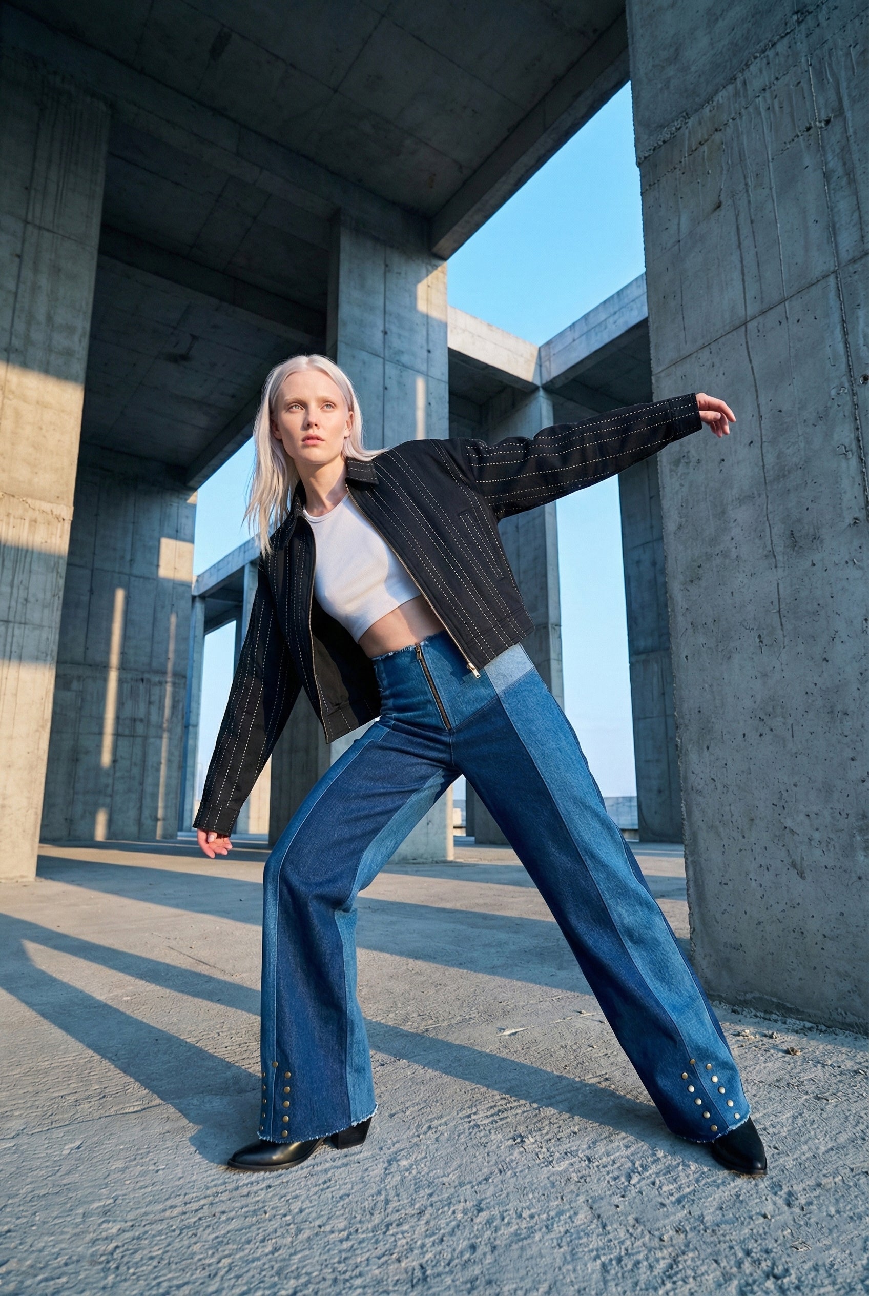 ARDEN - Stud Detailed Pants with Three Different Shades of Denim
